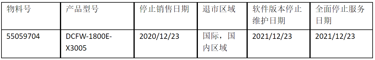 北京evo视讯真人官网云科信息技术有限公司正式通知您, 以上DCFW-1800E-X3005下一代防火墙(55059704)将于2020年12月23号停止接收新的订单(具体日期见上表),不再供货。给您带来的不便,敬请原谅。